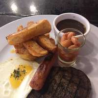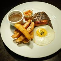 Beef fillet, egg, baked beans, chicken sausage and chunky potato with black pepper sauce