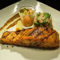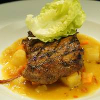 Chunky potato, grilled tomato and pineapple, crunchy romaine salad and black pepper sauce