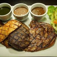 Beef fillet chop, chicken breast and crunchy romaine salad with black pepper sauce, mushroom and mint sauces.