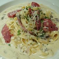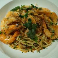 with prawns, mushroom, coriander leaf, chilli flake, fried garlic and olive oil