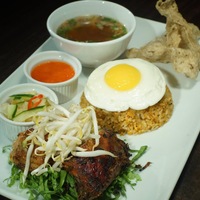 With grilled chicken percik sauce, air asam, crackers, pineapple salad and clear chicken soup