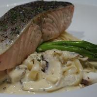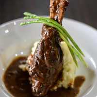 Combination of lamb and chicken, cruncy romaine salad, mashed potato with black pepper and mushroom sauce