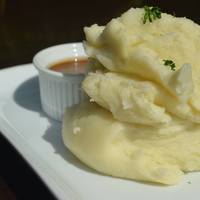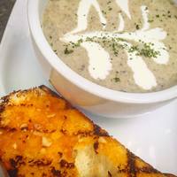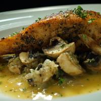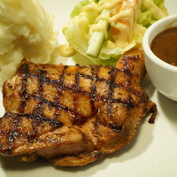 Boneless chicken leg, crunchy romaine lettuce, garlic bread, mashed potato with black pepper and mushroom sauce