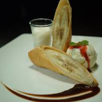 Banana wrapped with spring roll skin, vanilla ice cream and custard sauce