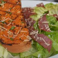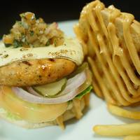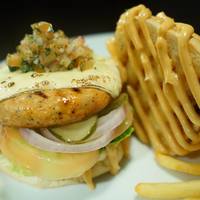 Chicken patty with tomato salsa, lettuce, onion ring, gherkin and cheese