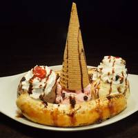 Grilled banana, ice cream cone, vanilla, chocolate and strawberry ice cream