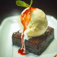 Mini bread and butter pudding, brownie with strawberry compote and vanilla ice cream