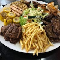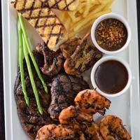 Beef fillet, lamb chop, chicken wings, prawns, grilled vegetables, garlic bread and fries with black pepper, mushroom and garlic sauce